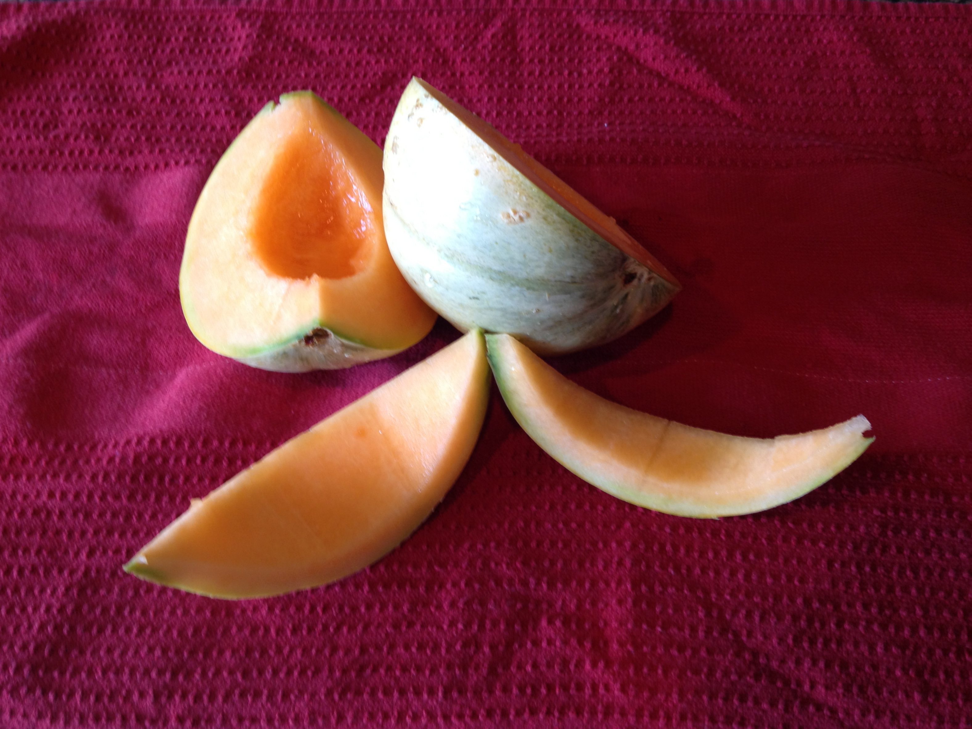 My Charentais french melons are ripening now. Wow! I think I have found a winner. I really love this one! Beautiful firm and sweet flesh. Just the right size for two people.