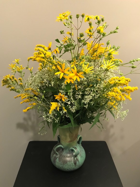 Three plants that are native to North America; Solidago (Goldenrod), Eutrochium purpereum (Joe Pye) , Helianthus divaricatus (Woodland sunflower) ceramic vase by California artist, Ann Mendershausen.