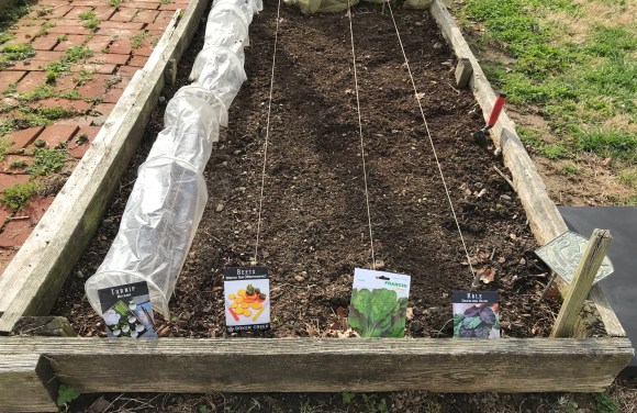 Planting the vegetable garden… This bed has roots & leafs; that is, Miyama turnips, Winter Sun beets, Italian chard, Dazzling blue kale.